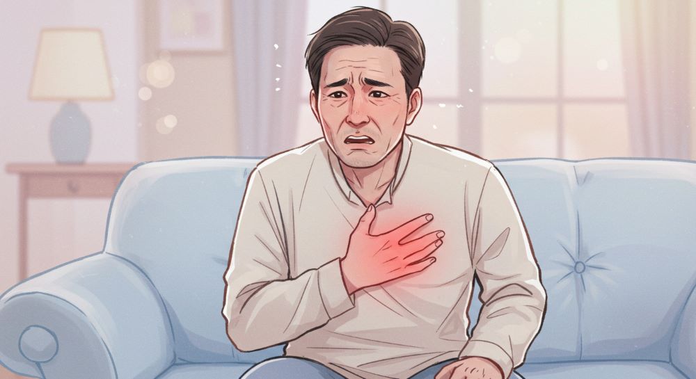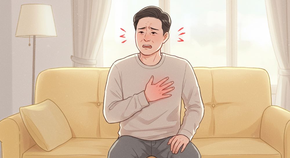 응급상황 대처: 심한 가슴 통증이 지속되고 호흡곤란, 식은땀 등이 동반되면 즉시 119에 신고하고 응급실로 가야 합니다. 협심증 기왕력이 있다면 니트로글리세린을 복용하고 안정을 취하세요.