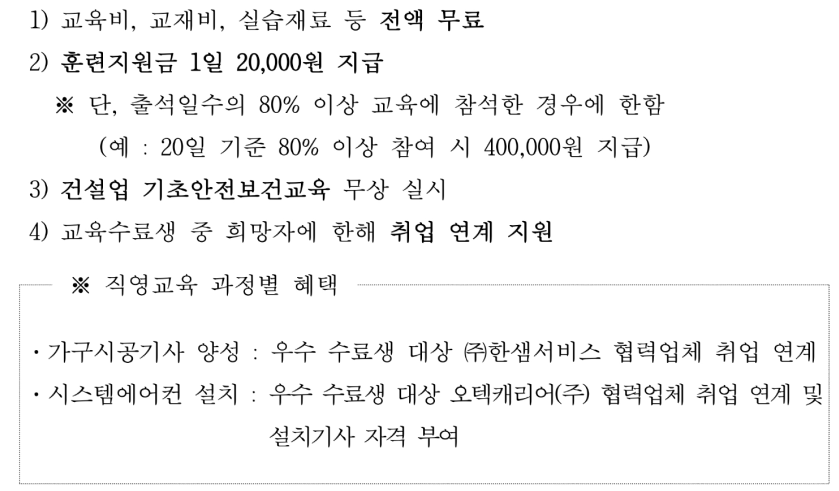 - 6개월 이내 즉시 취업이 어려운 자, 전년도 동일한 직종을 수강한 자, 당해연도에 숙련건설기능인력 양성사업 교육에 기 참여한 자