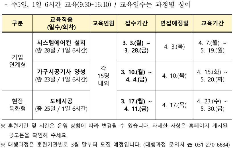 3월 3일 경기도일자리재단은 숙련건설기능인력 직영과정 1차 교육생 모집을 발표했습니다. 특히, 각 분야의 전문 인력을 양성하여 건설 현장의 효율성을 높이고자 합니다. 이번 내용에서는 시스템에어컨 설치 전문가, 가구시공기사, 도배시공 전문가 양성 과정을 알아보겠습니다.