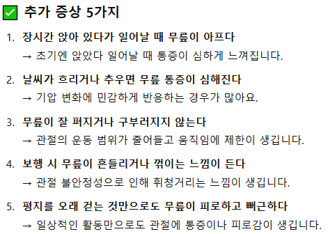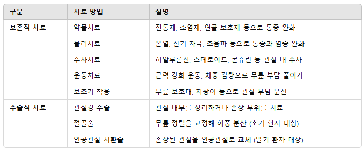 - 생활습관 개선: 체중 감량, 자세 교정, 무릎 보호대 착용 등 병행