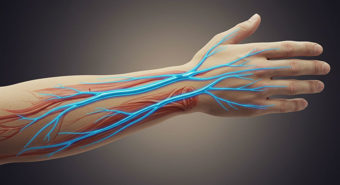 손목의 손바닥 쪽에 위치한 '수근관'에서 발생하는 가장 흔한 원인 중 하나입니다. 손목 관절 내 수근관이 좁아지거나 염증이 생기면서 정중신경이 압박받아 발생합니다.