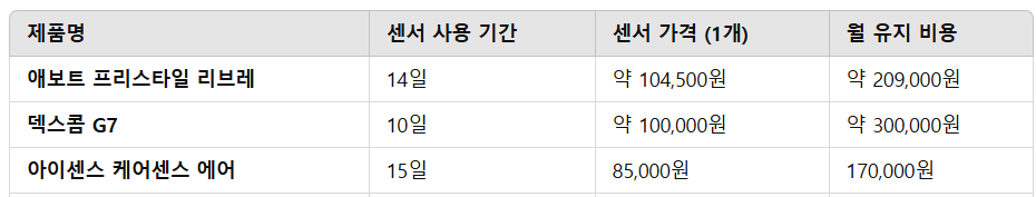 센서 기반의 기기 특성상, 연속 혈당측정기는 구입 비용 외에도 지속적인 소모품 교체 비용이 발생한다. 센서의 교체 주기는 대개 7일~15일이며, 제품에 따라 기능, 앱 호환성, 알림 기능, 방수 여부 등이 다르다.