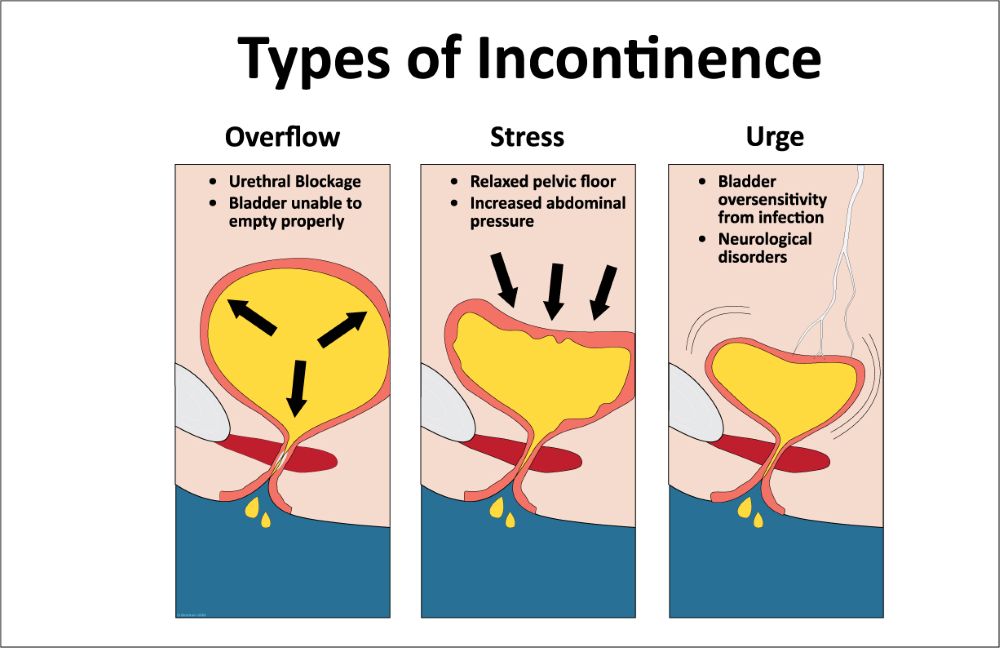 이 외에도 방광이 꽉 찼음에도 소변이 자연스럽게 넘쳐 흐르는 범람성 요실금, 신체적 문제로 제때 화장실을 가지 못해 발생하는 기능성 요실금도 존재한다.