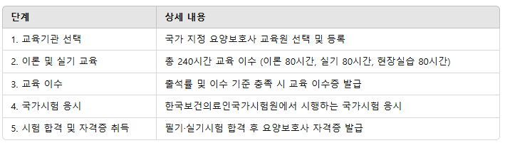 요양보호사 자격증을 취득하려면 먼저 보건복지부에서 지정한 교육기관에서 소정의 교육과정을 이수해야 합니다. 교육과정은 일반과정과 국가자격증 소지자 과정으로 나뉘며, 일반과정은 총 320시간의 교육을 이수해야 합니다. 교육은 이론, 실기, 실습으로 구성되어 있으며, 이를 모두 이수한 후 한국보건의료인국가시험원에서 시행하는 국가시험에 합격해야 자격증을 취득할 수 있습니다.