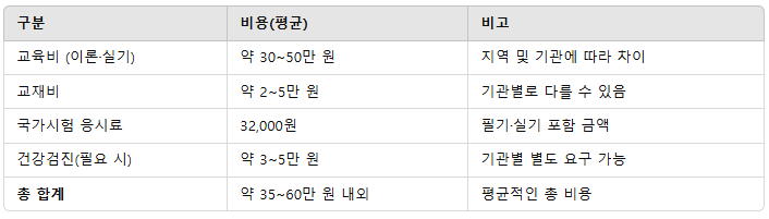 교육비용은 교육기관에 따라 다르지만, 일반적으로 80만 원에서 90만 원 정도입니다. 국가자격증 소지자의 경우 교육시간이 단축되며, 교육비용은 약 25만 원 정도로 감소합니다. 또한, 교육비 외에 시험 응시료 32,000원과 자격증 발급비용 10,000원이 추가로 발생합니다. 일부 교육기관에서는 내일배움카드를 통한 국비지원이 가능하므로, 해당 제도를 활용하면 교육비 부담을 줄일 수 있습니다.