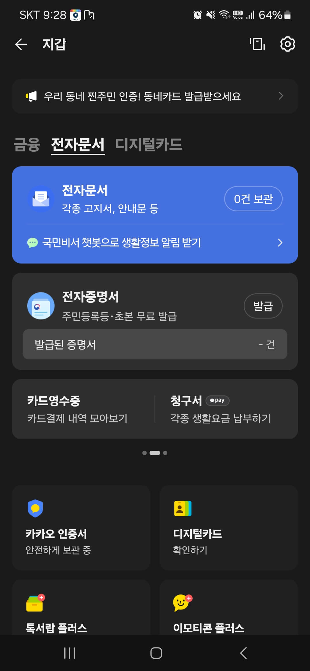 → 상단 ‘카카오 인증서’, ‘신분증’, ‘출입증’ 등을 한 곳에서 관리할 수 있습니다.