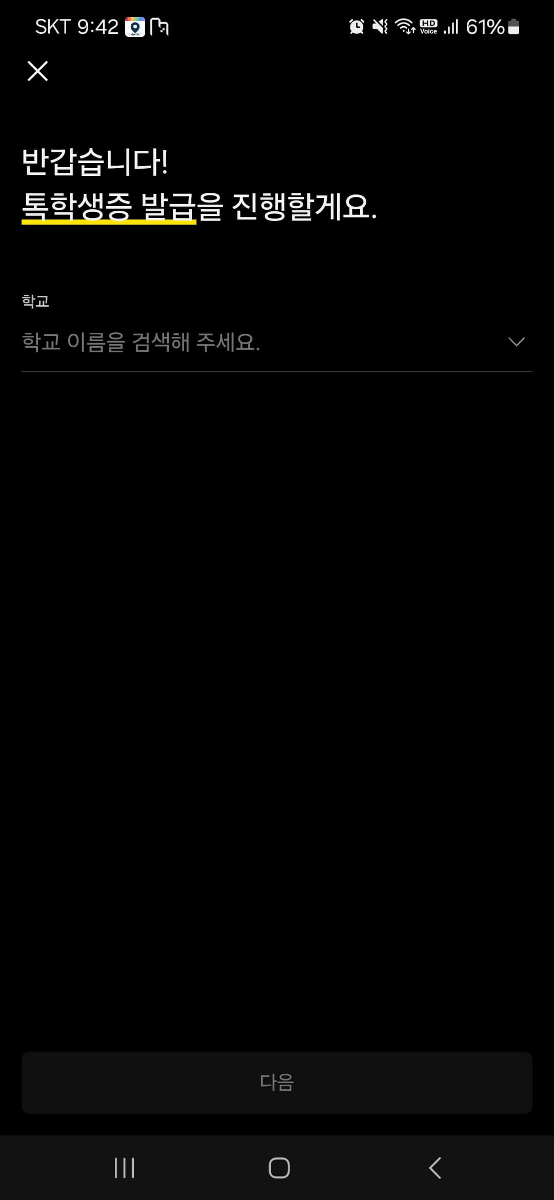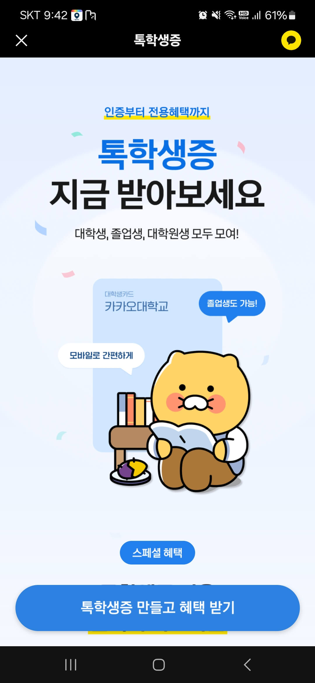 - 카카오톡 지갑 메뉴에서 본인의 이름, 학교, 학번 등의 정보를 입력해 톡학생증을 최초 발급합니다.