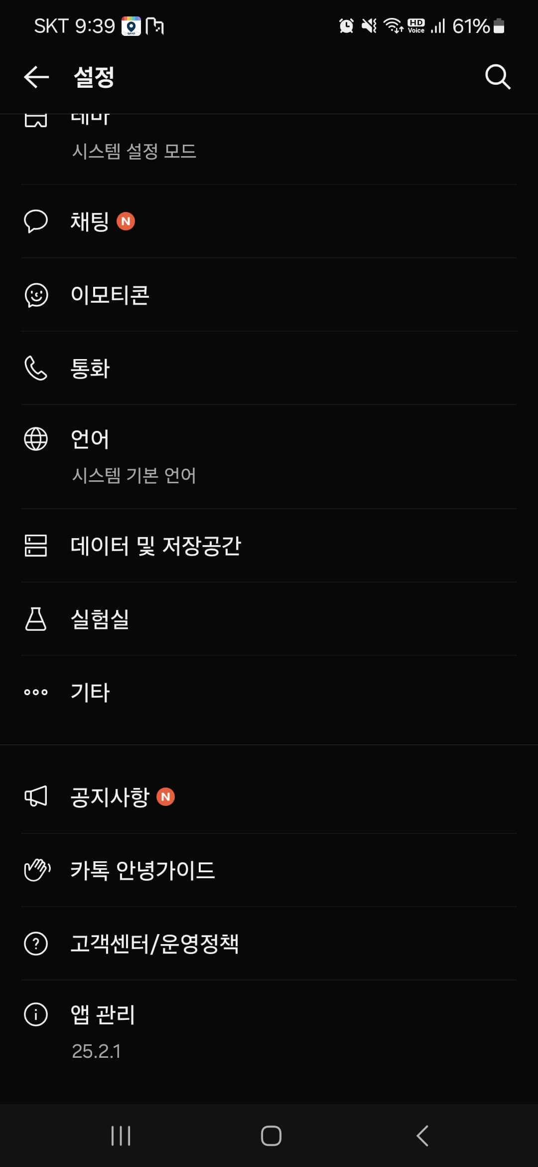 - 카카오톡 실행 후 [더보기 ≡] → 우측 상단 ‘설정(⚙)’ 아이콘 클릭