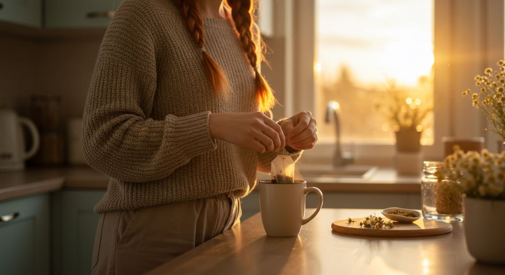 재료: 건조 캐모마일 1-2티스푼 (또는 티백 1개), 뜨거운 물 1컵 (200-250ml)