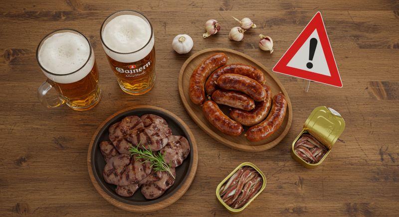 다음은 통풍을 악화시킬 수 있는 퓨린 함량이 높은 대표적인 음식들입니다.