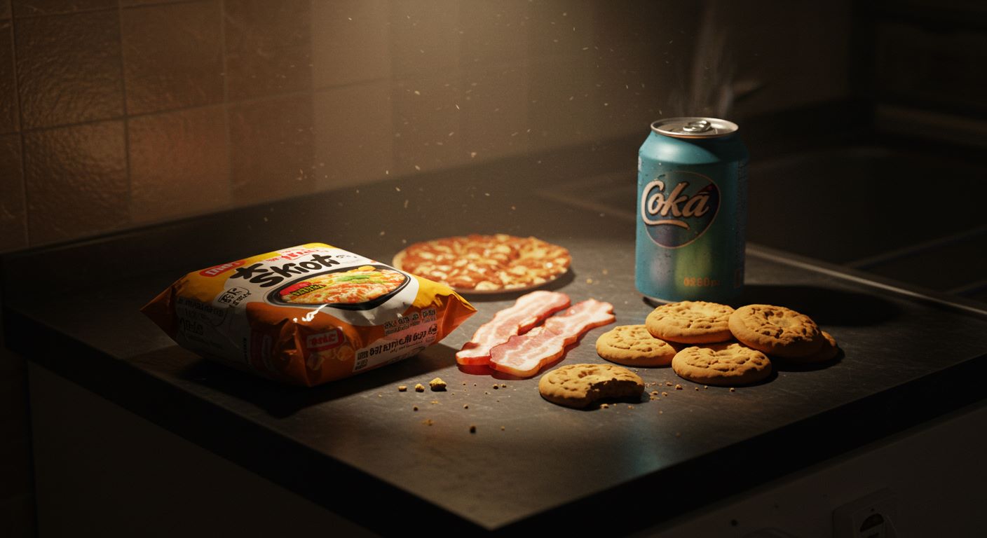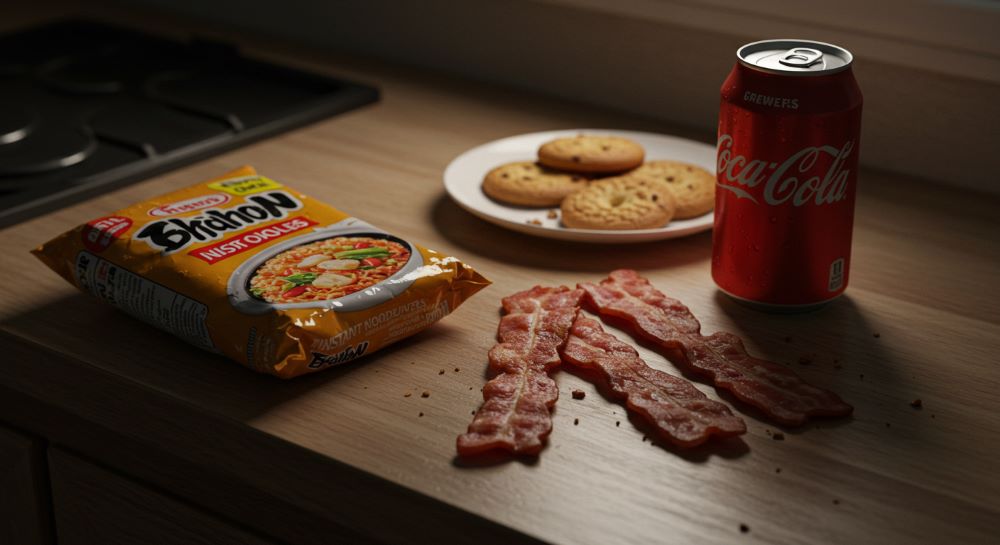 - 컵라면, 조미된 통조림 등은 염분과 첨가물이 많고 대사 부담을 증가시켜 요산 배출을 방해합니다.