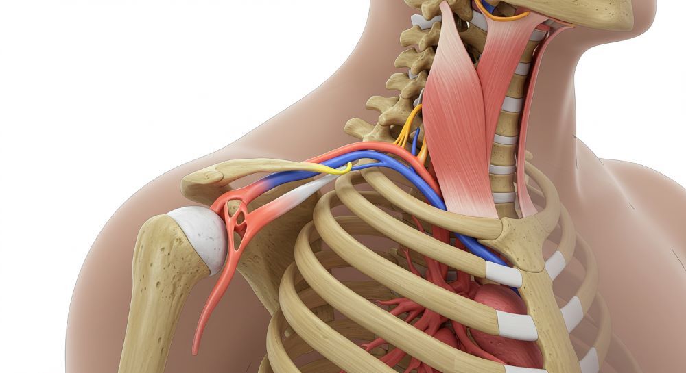 쇄골과 갈비뼈 사이 통로에서 신경·혈관이 눌리는 질환입니다.
