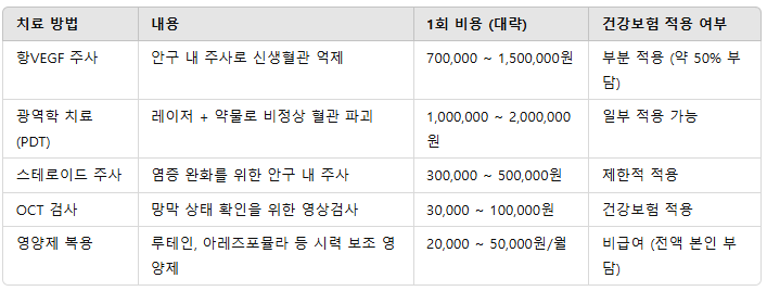• 항체 주사(Aflibercept, Ranibizumab 등): 보험 적용 시 1회 약 30만~50만 원