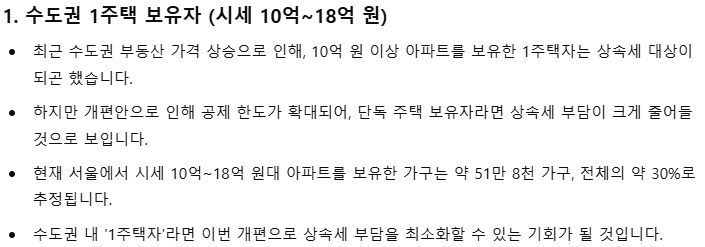유산취득세는 상속인이 직접 받은 재산에 대해 세금을 내기 때문에, 다자녀 가구나 중산층이 세제 혜택을 받을 가능성이 큽니다. 예를 들어, 기존에는 전체 유산에 대해 높은 세율이 적용되었지만, 개편 이후에는 각 상속인의 상속액이 공제 범위 내라면 아예 세금을 내지 않거나 매우 적은 세금을 내게 될 수 있습니다.